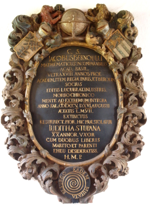 Monday, October 4, 2010 at 5:08PM The Bernoulli family of Basel produced three great mathematical geniuses, the oldest of whom was Jakob Bernoulli (1654—1705). He was born, worked and died here, holding a chair in Mathematics at the University of Basel.